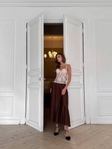 Він ніжно та впевнено обіймає, одночасно підкреслюючи природні вигини за рахунок утяжки талії до 6–8 см — перетворюючи твій силует на справжній витвір мистецтва.